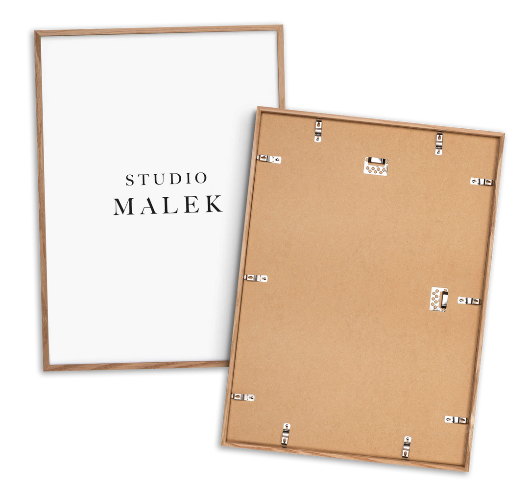 Utilizamos marcos de madera solida cortados con precisión por maquina para la creación de nuestros marcos. Actualmente están disponibles en diferentes acabados de madera, como negro, blanco y madera clara. Además, los marcos tienen caimanes de metal para colgarlos fácilmente.